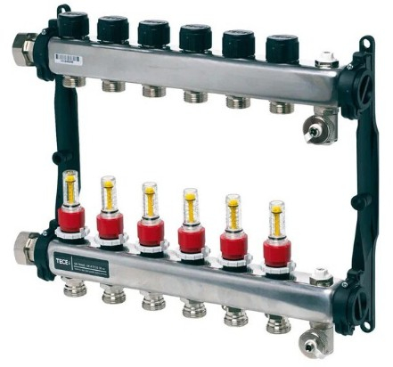 Distribuitor din oțel inoxidabil pentru încălzire, bară de distribuție cu volum mare, suprafață lustruită, suport din plastic fonoabsorbant cu funcție de asamblare rapidă, racord cu etanșare plană, cu piuliță olandeză de 1". Robineți de retur integrați cu etanșare pe tija supapei cu o-ring dublu, scaun de supapă cu etanșare cu o-ring pentru închiderea fiabilă permanentă a circuitelor de încălzire, debitmetru cu închidere, 0,2-5 litri cu mecanism de blocare conform EN 1264-4.