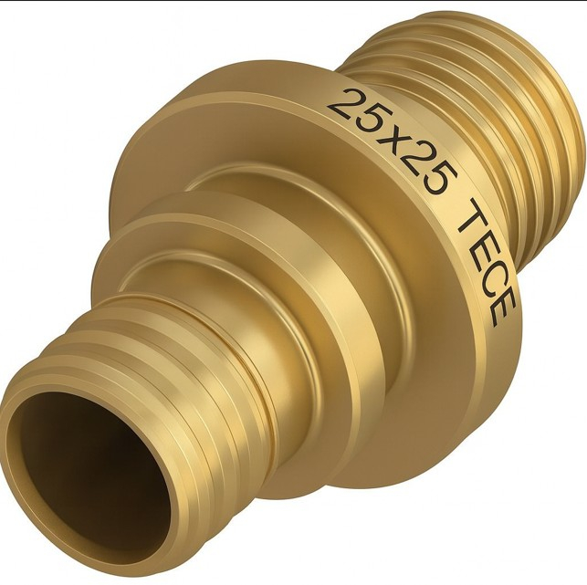 Este o cuplă (coupling) press‑fit din alamă, făcută pentru a conecta două țevi TECEflex sau TECElogo cu diametrul exterior de 25 mm.