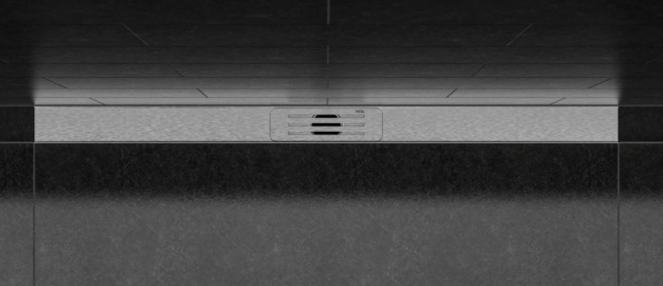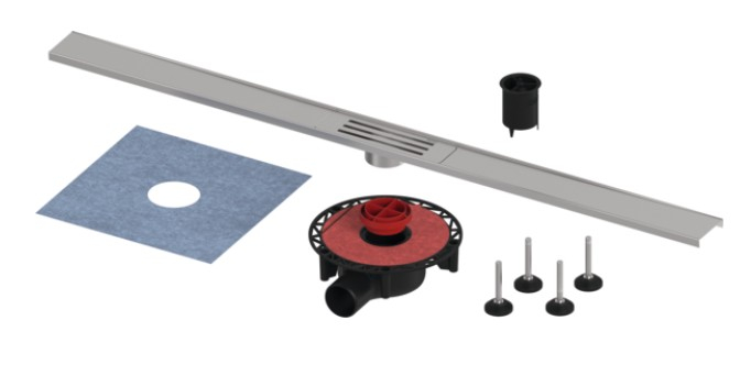 Profil de duș, destinat pentru instalarea în patul de adeziv, deasupra șapei și a sistemului de hidroizolație.