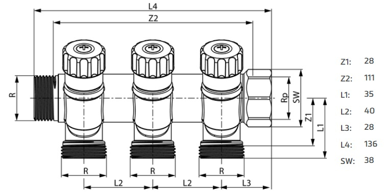 Distribuitor universal TECE, cu robineți de închidere, alamă standard