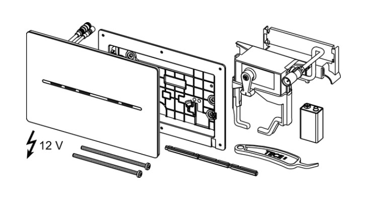 Clapetă de acționare electronică cu acționare igienică fără atingere pentru rezervoare TECE cu acționare frontală și înălțime de acționare de aprox. 1 m (clapetă de acționare centrală). Clapetă de acționare extraplată din oțel inoxidabil, inclusiv material de fixare și motor de acționare pentru spălare simplă sau dublă. Compatibil cu ușa de vizitare pentru tablete dezinfectante.